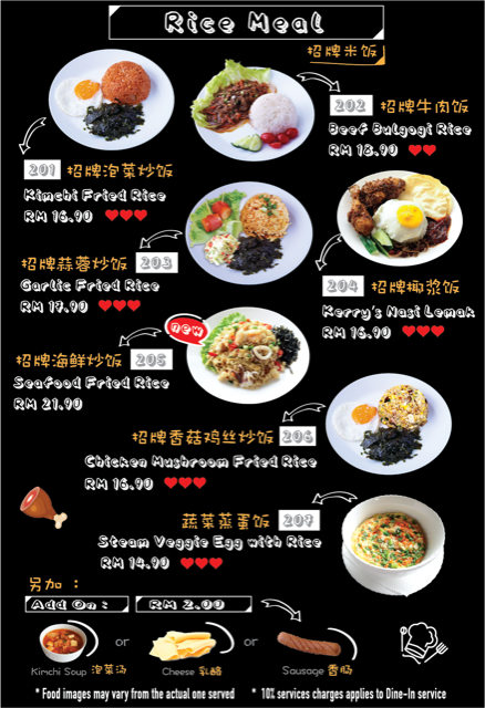 If you’re in the mood for something with a Korean twist, look no further than the Kerry's Garlic Fried Rice Set (MYR 22.90). Each bite bursts with flavor and is complemented by refreshing barley tea and seasonal fruits. The Kimchi Fried Rice with Egg Set (MYR 21.90) will delight spice lovers, delivering a harmonious balance of heat and savory goodness. For a taste that embodies warmth and comfort, the Beef Bulgogi Rice Set (MYR 23.90) is passionately crafted, ensuring that every mouthful is a memorable one.